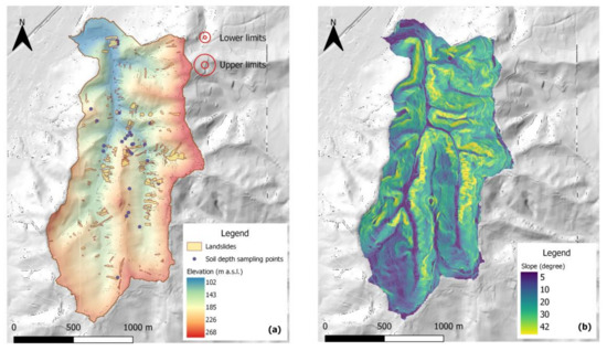 (a) Catchment topography with observed landslides triggered after the extreme rainfall on 27–28 April 2009 and location of soil thickness sampling points. Maximum and minimum areas (amin, amax) considered as lower and upper limits in the optimization process of the slip-surface search parameters for SCCOPS 3D are also represented; (b) catchment slope.