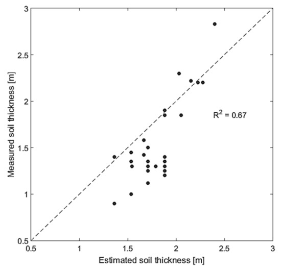 The location of the measuring points concerning the soil thickness used for the computation of the distribution of the soil depth within the study area is also reported in Figure 5a and the correlation between measured soil thickness points and the estimated ones is shown in Figure 6.