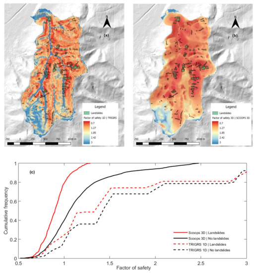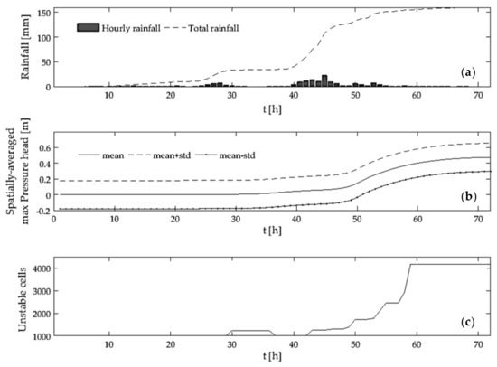 Figure 7 shows the spatially-averaged max pressure head (Panel (b)) and the amount of potential unstable cells (Panel (c)) within the study catchment during the rainfall event (Panel (a)) as a result of the 1D slope stability analysis (simulations by TRIGRS software v. 2.1). It can be noted that the number of cells corresponding to a factor of safety (FS1D) < 1 increases with total rainfall.