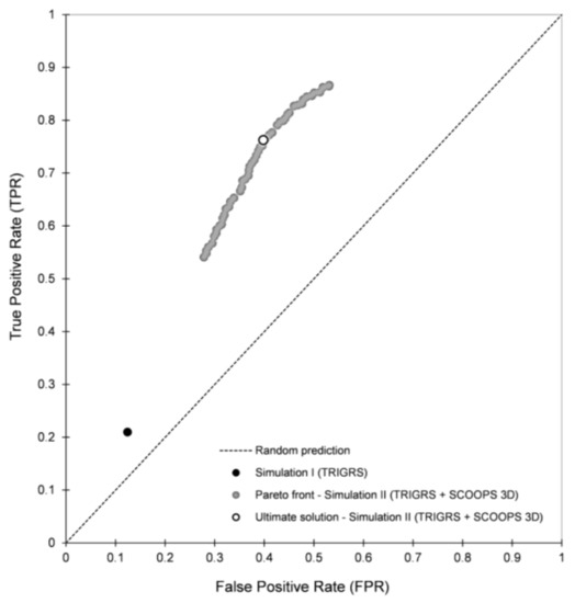 Figure 8 shows, in terms of FPR and TPR, the results of the comparison between 1D and 3D slope stability analysis as output of the two main simulations carried out. As expected, the output of TRIGRS is made up of a single pair of values FPR and TPR. The output of SCOOPS 3D is, instead, made up of a Pareto front of optimal solutions in the trade-off between FPR and TPR.