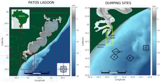 Left panel—Patos Lagoon, the Port of Rio Grande, and Cassino Beach. Right panel—Zoomed-in view of the Patos Lagoon estuary, where the squares indicate the position of the existing licensed disposal site and the alternative disposal sites investigated in this study (Sites A, B, C). Current bathymetric data were provided by the Brazilian Navy and Rio Grande Port Authority and interpolated for the domain.