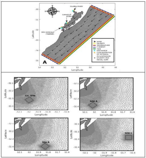 The representation of the discharge cycle for the dredged sediment in the TELEMAC-3D model was based on information provided by the Port of Rio Grande Authority and corresponds to the maintenance dredging operation carried out between 1 November 2013 and 19 December 2013 with a trailing suction hopper dredger (TSHD). During this period, 292 discharges were carried out at the licensed disposal site, for a total of 6 discards per day, and a volume of 10,300 m3 was discarded in each trip, when the TSHD sailed out to sea to a designated location and deposited the dredged sediment by opening its bottom doors (hatches). The dredge discharge time was 10 min. The total volume discarded at the Licensed Site at the end of the dredging was 3,000,000 m3, composed mainly of clay and silt. Exactly this dredging cycle was simulated considering the computational grids for the current licensed disposal site and the alternative disposal sites (Figure 2).