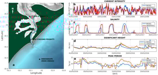 The model calibration and validation consisted of comparisons between model results and in situ data for the same time and location, based on statistical analyses (Relative Mean Absolute Error (RMAE) and Root Mean Square Error (RMSE) [50,80,81]. Thus, calibration and validation exercises of the TELEMAC-3D model for this study were performed based on data measured during the years 2006, 2016, and 2017, obtained from the Cassino Project [82], from the Rede Ondas Project (https: // redeondas.furg.br/pt/ accessed on 15 July 2019), which is a member of the Global Ocean Observation Program (GOOS), and data from the PELD Project (https://peld.furg.br/ accessed on 15 July 2019) (Figure 3).