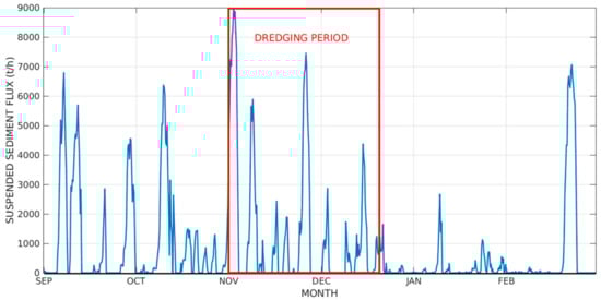 An estimate of the natural export of suspended sediment from Patos Lagoon towards the coast (Figure 4) was calculated based on a time series of discharge from a point located at the mouth of the estuary and the water column mean suspended sediment concentration, where positive (negative) fluxes indicate flood (ebb) flow. The red box indicates the period when the dredging was carried out. During the entire simulated period, Patos Lagoon exported an average of 895.4 t/h, totaling 642,000 t of material in suspension exported to the coastal zone during the simulation period. During the dredging period (rectangle in red), the average discharge was 1314.8 t/h, totaling 272,160 t of exported material.