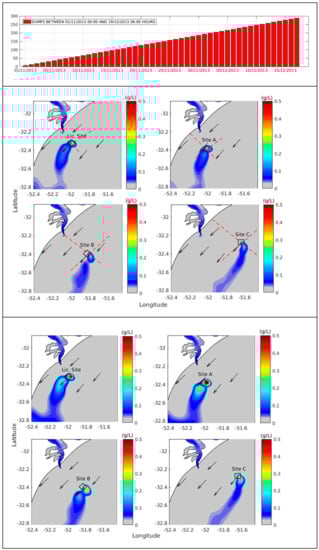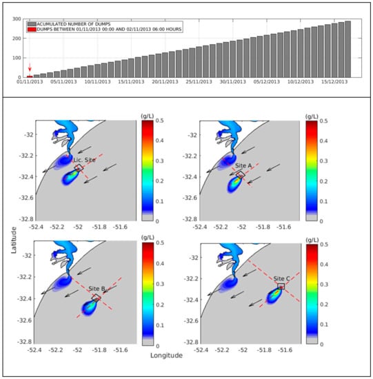Together with the Patos Lagoon natural contribution, during the simulated period, the South Atlantic Inner Shelf also received suspended sediment concentrations in specific open ocean disposal sites, the Port of Rio Grande Licensed Site, and another three alternative theoretical sites called Site A, Site B, and Site C, resulting from a dredging operation carried out in November–December 2013. The calculated evolution of the discharge process and resultant suspended sediment plume dispersion was followed over time (Figures 5, 7 and 9). Longitudinal and transversal profiles were also extracted from the same model results to represent what happens to the dredged sediment in the water column (Figures 6, 8 and 10).
