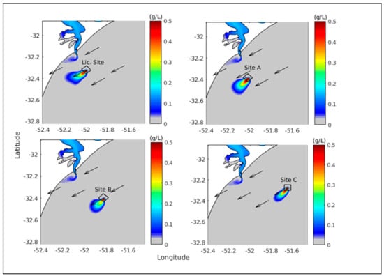For the transversal profile to the coast (Figure 6, right panel), suspended sediment concentrations from the Patos Lagoon coastal plume are present close to the coast when considering the Licensed Site and also Sites A and B, but not in Site C due to the position of the transect (Figure 5). The suspended sediment discarded at the disposal sites (red color), on the other hand, tends to remain at the disposal site, without showing a tendency of transport towards the coast in any of the modeled scenarios. It is important to highlight that the low concentrations observed in the transversal profile for Site B are due to the effect of the wind transporting the suspended material towards the southwest, since the location of the profiles was defined in relation to the center of each disposal area. In addition, during this moment of the dredging cycle, there is no evidence of interaction between the suspended material from the coastal plume of Patos Lagoon and the suspended sediment disposed of in any of the simulated disposal sites.
