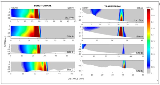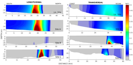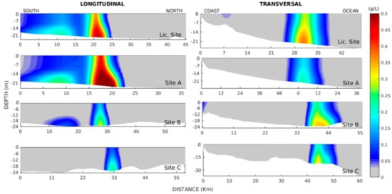 Longitudinal (left column) and transversal (right column) profiles representing the dispersion plume throughout the vertical after 292 discharges (starting on 19 December 2013 at 00:00 h) on the Licensed and alternative disposal Sites A, B and C. Color scale indicates suspended sediment concentrations (g/L), where gray indicates concentrations lower than 0.025 g/L.