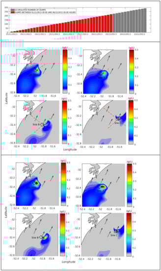 As the predominant wind condition in the area is from the NE [49], the Patos Lagoon coastal plume is expected to be displaced to the southwest most of the time. The authors [61,81,88] carried out numerical simulations about the Patos Lagoon coastal plume behavior and concluded that during this condition, a recirculation zone south of the mouth of the lagoon is observed due to local geometry and bathymetry and in response to the wind, which explains why the fine sediment deposits are mainly found there. Similar numerical results for the Patos Lagoon coastal plume contribution to deposits observed at the south of the lagoon mouth are presented in Figure 11 and their weak interaction with the calculated dispersion plumes of the disposal sites is evident in Figure 6, Figure 8 and Figure 10. Furthermore, [56] also mentioned that this fine sediment export through the coastal plume produced extensive mud deposits called Patos facies, which have a strong influence on the inner shelf morphology.