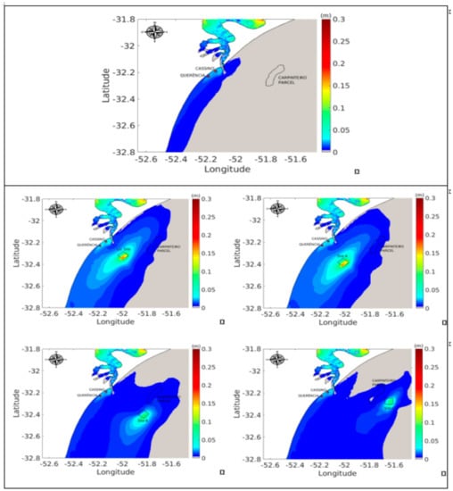 Sedimentological data demonstrated that the Patos Lagoon drainage basin (more than 200,000 km2) and anthropogenic effects associated with dredging activities and secular deforestation related to settlements and crop cultures are significant sources of fine sediments to the adjacent shoreface and inner continental shelf off the South Atlantic region [56]. Fine sediment export through the lagoon’s inlet is mainly observed during periods of NE winds and high freshwater discharge [79], presents significant interannual variability [51,53] and was estimated as 3.7 × 104 t/day by [79], while this study estimated the same order of magnitude for the Patos Lagoon suspended sediment natural contribution during the simulated period (895.4 t/h = 2.1 × 104 t/day, Figure 4).