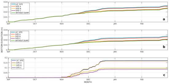 Once we understand the natural contribution of fine suspended sediments from Patos Lagoon, we can move forward to look at what happens with the dredged sediment at specific disposal sites (the actual Licensed Site and another three proposed alternative sites). The results suggest that the investigated disposal sites had different responses and can be analyzed in pairs (Licensed Site and Site A, and Sites B and C). Calculated bottom evolution results suggest that the sediment discharged in the Licensed Site and in Site A tend to remain in the area (bottom evolution around 17 cm) (Figure 12c) with some dispersion occurring around the sites (Figure 11, bottom panel) but always resulting in small bottom evolutions throughout the coastal zone (<2 cm, Figure 12a,b). Site B and Site C, on the other hand, presented a maximum bottom evolution of around 10 cm, suggesting that part of the material is leaving the sites.