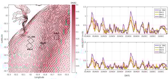 The explanation for this behavior can be related to the hydrodynamic conditions observed in each disposal site. Thus, Figure 13 presents the calculated mean current velocity for the discharge period (left column), together with calculated time series of current velocities at the surface and bottom (bottom column) extracted at the points of maximum bottom evolution in each disposal site. A preliminary analysis of the mean current velocities (Figure 13, left column) suggests that the Licensed Site and Site A are located in shallower areas with weaker current velocities (around 0.10 m/s), which favor the permanence of the dredged sediment, while Sites B and C are located in areas of stronger current velocities (around 0.25 m/s), which promote the advection of the dredged sediment. The calculated current velocity time series for each scenario (Figure 13, right column) corroborates these results.