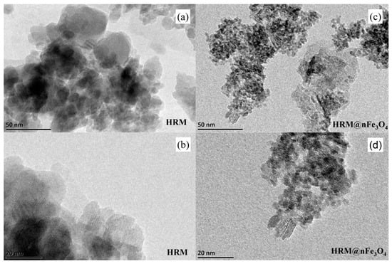 TEM images of HRM and HRM@nFe3O4: (a,b) TEM images of HRM; (c,d) TEM images of HRM@nFe3O4.