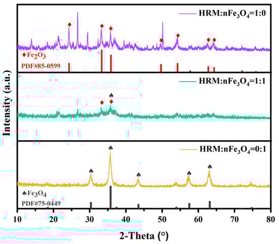 Figure 2 shows the XRD patterns of HRM, HRM@nFe3O4 and nFe3O4 (HRM: nFe3O4 with mass ratios of 1:0, 1:1 and 0:1). The pattern of HRM exhibited an unordered structure with the peaks at 24.22°, 33.22°, 35.78°, 49.62°, 54.18°, 62.66° and 64.29°, which represented the Bragg reflections from the (110), (121), (−110), (220), (132), (130) and (−211) planes, respectively, typical of Fe2O3 phase (Reference code: 85-0599). The HRM used in this study is rich in Fe2O3, and the result is identifiable to the XRF. For the synthetic nFe3O4, the high-intensity peaks were observed at 2θ = 30.36°, 35.76°, 43.47°, 57.51°, and 63.17° in the XRD pattern, which represented the Bragg reflections from the (220), (311), (400), (511), and (440) planes, respectively (Reference code: 75-0449). This means nFe3O4 was successfully loaded by the synthetic method in this study. Although some peaks could be found at 10° to 45° in the XRD pattern of the HRM@nFe3O4, it was difficult to distinguish the Fe2O3 and Fe3O4. In addition, there was no distinct peak at 2θ ranging from 45° to 80°, illustrating that the original spinel structure of HRM was changed by adding nFe3O4, and the HRM@nFe3O4 was the amorphous phase. Notably, the non-crystal phase of HRM@nFe3O4 might result from the vigorous stirring and low-temperature drying in the synthesis procedure [44]. The performance of adsorption of HRM@nFe3O4 might be dependent on its amorphous structure and various functional groups on the surface. The adsorbability and surface activity of amorphous ferric oxide to antimony were demonstrated to be much stronger than that of crystalline goethite, according to the previous research [45].