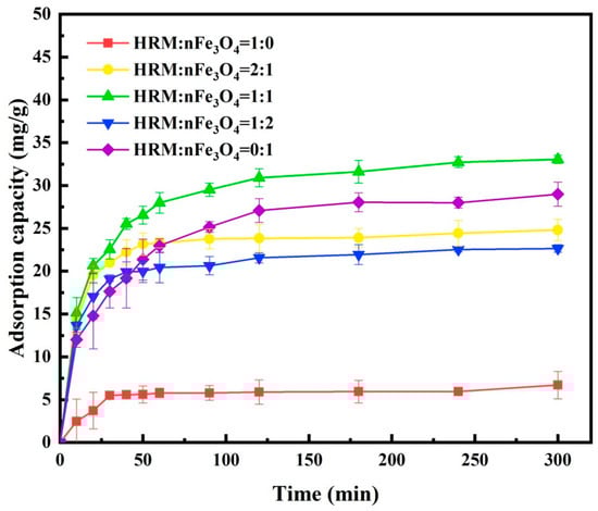 To examine the best mass ratio of nFe3O4/HRM on Sb(III) adsorption, several HRM@nFe3O4 sorbents with different nFe3O4:HRM mass ratios of 0:1, 1:2, 1:1, 2:1 and 1:0 were used in Sb(III) adsorption tests. As shown in Figure 3, the adsorption capacities of various types of synthetic HRM@nFe3O4 were all higher than pure HRM. When the mass ratio was 1:1, the adsorption capacity was the largest, at approximately 33 mg·g−1. Hence, the nFe3O4 with an HRM mass ratio of 1:1 was selected as a feasible HRM@nFe3O4 material and applied to the following tests.