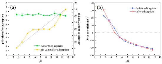 Sb(III) removal by HRM@nFe3O4 as a function of pH values and the zeta potential: (a) the pH value after adsorption and the adsorption capacity at different pH levels; (b) zeta potential before and after adsorption. Initial Sb(III) concentration = 10 mg·L−1, sorbent dose = 0.2 g·L−1 and T = 298 K.