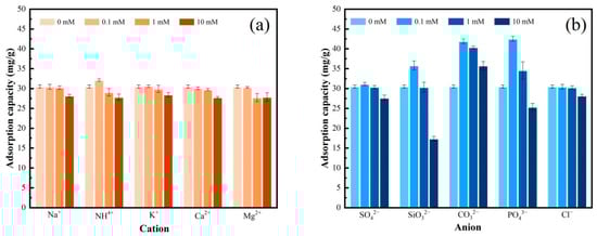 (a) Cations on the removal of Sb(III) and (b) anions on the removal of Sb(III). Initial Sb(III) concentration = 10 mg·L−1, sorbent dose = 0.2 g·L−1, pH = 4.6 ± 0.1 and T = 298 K.