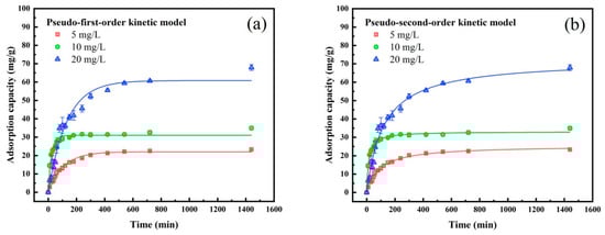 where qe is the adsorption capacity (mg·g−1) of the adsorbent at equilibrium, qt is the sorption capacity (mg·g−1) at pre-selected time t (min), k1 (min−1) is the pseudo-first-order rate constant for the absorption process, and k2 (mg·(g·min)−1) is the pseudo-second-order rate constant. The related parameters are shown in Table 1.