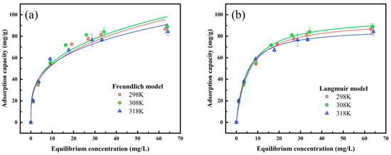 The adsorption isotherms of HRM@nFe3O4 were set at 298 K, 308 K and 318 K in the different initial Sb(III) concentrations of 5–80 mg·L−1. The adsorption kinetics were conducted by sampling at the specified time under 298 K and at a pH of 4.6 ± 0.2, and the initial concentration of Sb(III) was 5, 10, and 20 mg·L−1.