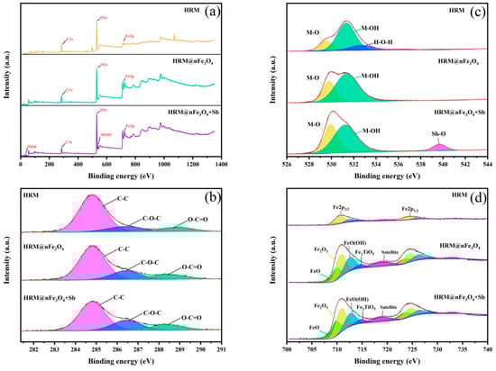 The chemical compositions of HRM and HRM@nFe3O4 before and after Sb(III) sorption were further examined by XPS. As displayed in XPS survey spectra in Figure 8a, the HRM@nFe3O4 after Sb(III) adsorption presented the characteristic peaks of C1s, O1s, Fe2p, Sb3d3 and Sb4d, while HRM and HRM@nFe3O4 only showed the characteristic peaks of C1s, O1s and Fe2p. The emergence of Sb3d3 and Sb4d peaks were observed after Sb(III) adsorption, suggesting the successful attachment of Sb(III) on the surface of HRM@nFe3O4. The intensity of Fe2p peaks was much weaker in HRM than that in HRM@nFe3O4 because of the lower Fe content, which was in agreement with EDS results. The C1s spectrum of HRM@nFe3O4 was differentiated into three peaks at binding energies of 284.8, 286.4 and 288.4 eV, corresponding to C=C, C-O and C=O bonds, respectively [4]. As shown in Figure 8b, the peaks of carbon were hardly shifted after modification by nFe3O4, but the peak area ratio of C-O and C=O was increased. This proved that the chemical environment around carbon was changed after adding nFe3O4 [62].