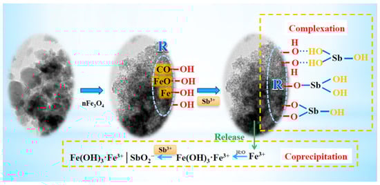 The potential adsorption mechanisms between Sb(III) and HRM@nFe3O4 are shown in Figure 9. It is obvious that Sb was chemically bonded with Fe from the XPS analysis, which was coincident with the results of sorption isotherms and sorption kinetics. Additionally, the larger specific surface area (SBET) on HRM@nFe3O4 indicated that there were more active sites and better antimony adsorption performance. Furthermore, surface complexation reaction between Sb(III) and amorphous ferric oxide, including nFe3O4 and its by-products FeO(OH) and Fe(OH)3, played an indispensable role in the removal of Sb(III) by HRM@nFe3O4. Hydrogen bonds between hydroxyl groups on HRM@nFe3O4 and antimony molecules were also conductive to the removal of Sb(III) [37,43]. Moreover, a small number of corrosion products of HRM@nFe3O4 produced by Fe3+ could remove Sb(III) from the aqueous phase by co-precipitation [43,84]. It is reasonable to speculate that the loading of nFe3O4 changed the surface structure and the functional groups such that the adsorption capacity was improved eventually.