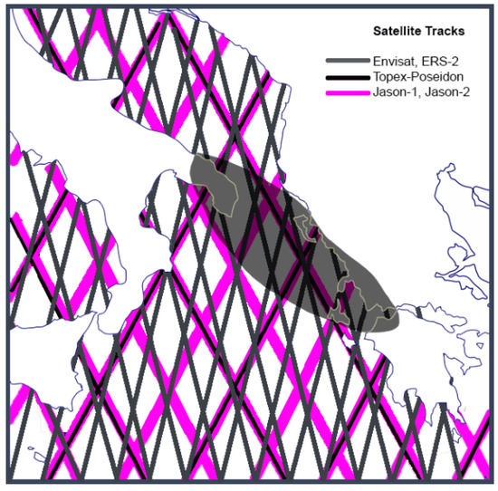 Trajectories of the TOPEX/POSEIDON, Jason-1, Jason-2, Envisat and ERS-2 satellites in the eastern Mediterranean region. The dark area describes our study area.