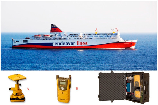 The ship utilized was the “Ionian Queen of Endeavor Lines.” The GNSS receiver (GB-1000 from Topcon with PG-A1 antenna) was placed in a suitable position on the ship’s deck for decreasing the multi-reflection effect. Figure 2 shows the locations of the receiver antenna (A) and the receiver (B)—which was located inside a watertight suitcase used for its protection. The records concern the period from 30 January to 20 July 2010 and involved 142 passes. These were recorded at a sampling rate of 1 Hz and a circumferential angle of 15 degrees, which protected the GNSS receiver from any side obstacles.