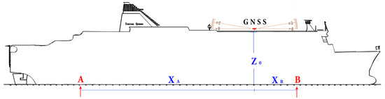 Α systematic recording of the ship’s elevation was performed at two points of the ship (bow (B) and stern (A)) along with the collection of the GNSS records. These points are illustrated in Figure 3. The altitudes were recorded by the ship’s crew at each of the port stations of the route (Patras–Igoumenitsa–Brindisi). Due to the ship’s loading and unloading, the draughts were taken by the crew just prior to departure and after the ship had been fully loaded. Devices calculating the draught at points A and B were permanent ship equipment and operated—according to their specifications—with a precision of 1 cm. The received draught data were used for determining accurately the distance of the receiver from the surface of the sea. Table S2 illustrates indicative data concerning the ship’s draughts (hΑ and hΒ) at points A and B.