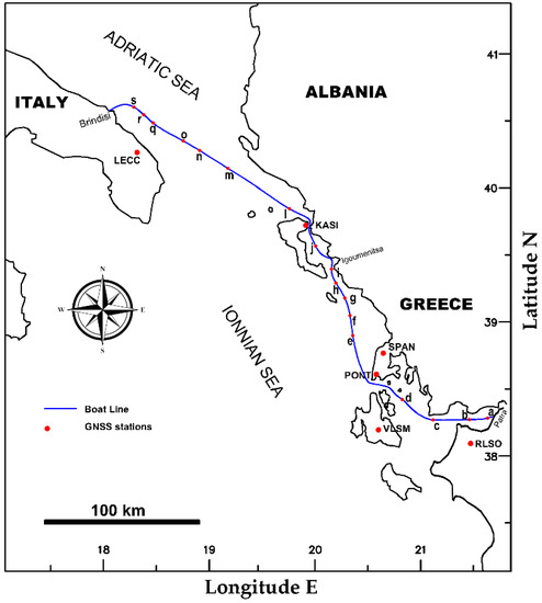 Map of the study area showing the ship’s principal route as well as the GNSS ground stations used during the processing. The route was not exactly the same each time, because the ship followed a slightly different path on each voyage. The points a–s marked here along the “principal route” refer to some of the figures. The stations RLSO, VLSM, PONT, SPAN and KASI belong to the National Observatory of Athens (NOANET GNSS NETWORK), and the station LECC to the Italian Positional Service (ItalPoS).