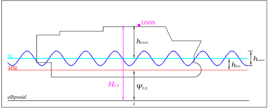Figure 5 shows a schematic representation of the main parameters of Equation (1). It should be noted again that the parameter H(t,i) is deduced from the GNSS recordings, whereas the parameter hGNSS is calculated by means of geometric characteristics of the ships taking into account the draught of the ship. Moreover, the estimations of the effects of astronomical and meteorological factors of the tide were based on GNSS measurements in ports and static solutions in order to determine the geometric altitude H (i,t) in ports.