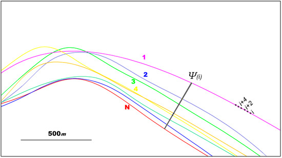Before the next subsections, it is important to note that the multiple-paths approach developed in this work had to address the following methodological problem: The ship, on each separate route, although driven by an automatic satellite navigation system (using GNSS), does not always follow an identical route. It deviates in the horizontal plane. Figure 6 illustrates an indicative area, near to the port of Brindisi, with nine different crossings. It is seen that the different routes, although somewhat parallel, may vary by tens of meters. The deviation may be even greater. An example is illustrated in Figure S1. It concerns eight different routes (11/2–19/2, route IDs 13–21, Table S1). In view of the above for determining the altitude H (i,t), we cannot use a point on an individual route (e.g., route 1, Figure 6), but instead must use a “mean point” on the straight section that intersects almost vertically all the different paths at corresponding points. These “mean points” constitute the “principal path” illustrated in Figure 4. It is important to note that the differences in the values of H (i,t) determined at these corresponding points are actually negligible, and this allows us to draw conclusions for a broader zone around the “principal route.”