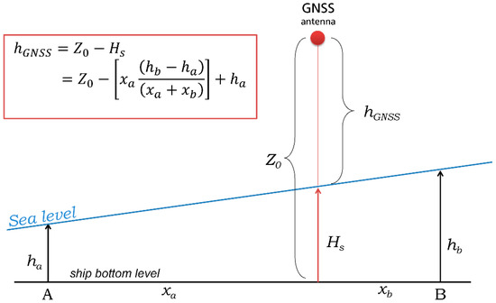 where is the requested height of the receiver relative to the sea surface; is the known height of the receiver relative to the ship’s bottom level horizontal keel; is the measured ship draughts at control points A and B (see Figure 3); and are horizontal distances from the A and B points of the depth-meters in relation to the projection point of the GNSS receiver on the AB section of the horizontal keel; is the draught altitude at the intersection point corresponding to the projection point of the GNSS receiver on the AB section of the horizontal keel.