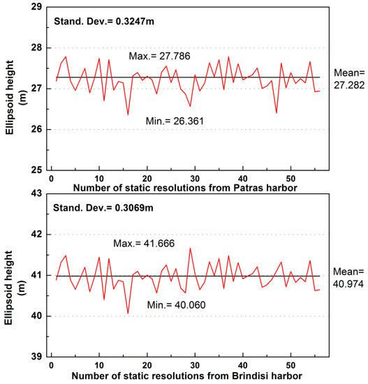 The determination of the impacts of the astronomical and meteorological factors of the tide, , on the requested parameter, Ψ(i), allows removing their influence. To determine such an impact, we used to a static solution in the ports. The ship remained each day in the ports of Patras or Brindisi for a period of 4 h and this allowed solving statically the altitudes in all cases. The time period chosen for resolution (2.5 h) was less than 4 h in order to correspond to the time that the ship was completely empty and not in the process of loading or unloading. Taking into account the magnitude of the tide and the rate of its change in the area [32] we considered that at this period the sea level remained constant, and thus a static solution could provide a reliable estimate of the altitude of the sea level in ports. The static solution of altitude in ports was performed following the PPP methodology. Figure 8 illustrates the results of the static resolutions in both ports. The mean values and the standard deviation values are also illustrated. Representative results are also illustrated in Table S3.