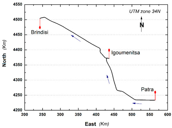 The data obtained from the GNSS recordings were classified into separate routes illustrated in Table S1. Each route corresponds to a passage of the ship in the line Patra–Igoumenitsa–Brindisi or Brindisi–Igoumenitsa–Patra. These 142 routes were solved by all six reference stations (Figure 4). However, fifteen routes were not used because they could not be resolved by the base stations, as they showed unresolved uncertainties. Moreover, seven additional routes cannot be solved by the LECC station. Thus, 120 of the 142 routes were finally utilized. For improving the accuracy of the results, a static solution of the six reference stations and a correction of their coordinates were completed prior to carrying out the kinematic solution. Figure 9 depicts the horizontal coordinates of the ship’s principal route as solved by the PONT-based D-GNSS method (see also Figure 4).