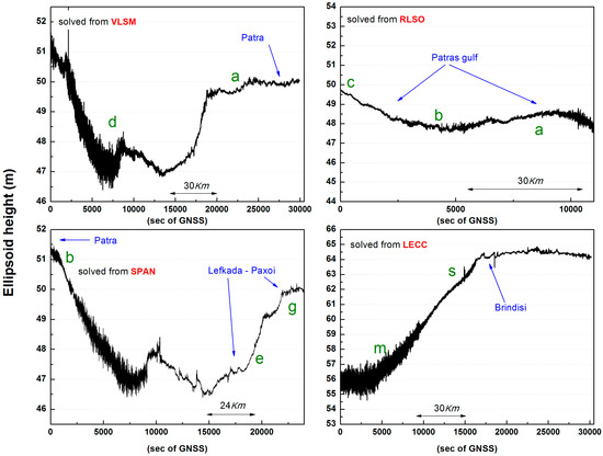 Typical examples of initial D-GNSS solutions by: VLSM (ID route 18), RLSO (ID route 24), SPAN (ID route 110) and LECC (Stack ID route 2). The points a–s are the route points illustrated in Figure 4. Thus, they visualize the parts of the route presented each time. Indicative lengths inside the parts of the route presented each time are illustrated. The values illustrated on the y-axis have not been corrected for the height of the receiver relative to the sea surface, hGNSS.