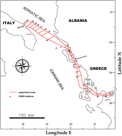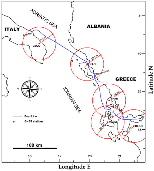 Data from permanent GNSS stations in Greece and Italy were also collected, in addition to those collected by the GNSS on the boat. The locations of the recording stations are shown in Figure 4.