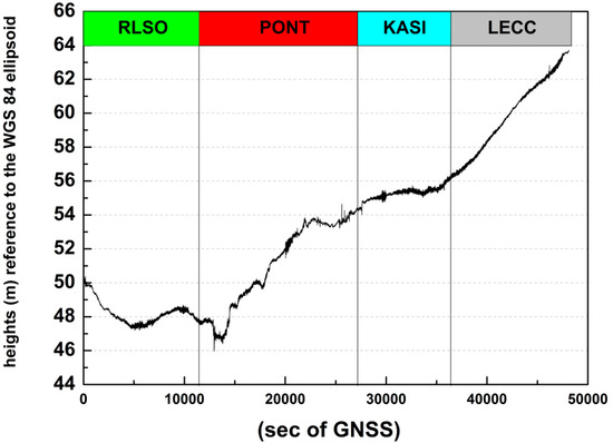 Example of a “combinatorial” solution using the D-GNSS method for path ID 71. The RLSO, PONT, KASI and LECC stations have been used. The RLSO, PONT, KASI and LECC stations were used, respectively, for the parts of the route, Patras to c, c to g, g to m and m to Brindisi. The values illustrated on the y-axis have not been corrected for the height of the receiver relative to the sea surface, hGNSS.