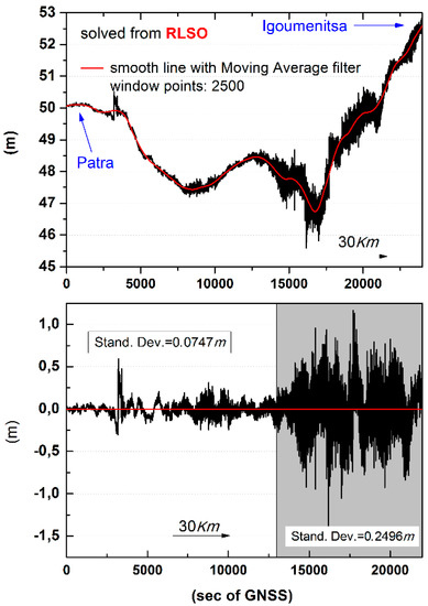 To decrease the noise level further, we proceeded to a noise correction with the Savitzky–Golay filter. The filter is based on the repeated adjustment of a polynomial utilizing the least squares method [39]. Figure 13 (top) illustrates the part of the Patra–Igoumenitsa route resolved by the RLSO station and the estimate of the moving average (red line). By subtracting the original signal from the estimates of the moving average, Figure 13 (bottom) was obtained. The left-hand side of the figure (white) represents part of the route near the settlement station, justifying the quite small standard deviation. In contrast, the differences on the right-hand side of the figure (gray), representing part of the route at a significant distance from the settlement station, are characterized by larger standard deviation. This was to be expected, taking into account the considerations of the previous paragraph.