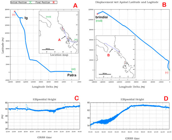 Solving with the PPP method on a horizontal and a vertical plane. (A,B) Resolved horizontal coordinates, track ID. (A) The route between Patras and Igoumenitsa (30 January). (B) The rest of the route up to the port of Brindisi (31 January). (C,D) The vertical components of the sections (A,B), respectively.