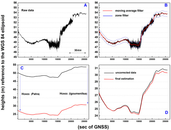 Illustration of the Patra–Igoumenitsa route with ID1 (see Table S1). (A) The raw data of the GNSS altitude during the route as they emerged from the PPP solution. (B) The raw data, the curve of mean values (red curve) obtained by applying the Savitzky–Golay moving average filter and the two curves (light blue) indicating the limiting values imposed by the band filter. (C) hGNSS receiver elevation correction at port check points described in Section 3.2. (D) Linear correction based on deviations of measured port levels from the medium marine level (linear tidal correction described in Section 3.3). (For more examples see also: Figure S3–S5).