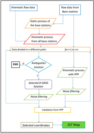 In this section, the analysis procedure that has been followed to render it more comprehensible is briefly visualized. The basic steps of the methodology are illustrated in Figure 16 in the form of a flowchart. The raw GNSS data are those obtained from ship’s routes (kinematic raw data) and those obtained from the ground stations. The first step involved static solutions in the base stations, whereas the second step was a kinematic solution of all routes from all base stations following the D-GNSS method. Then two different calculations were done in parallel. One concerned the application of the D-GNSS method, and the second, the application of the PPP method. Concerning the D-GNSS application, it was first examined whether the D-GNSS (LGO) software resolved the uncertainties relevant to a given route. If that had not happened, the results were discarded. For the routes where the uncertainties were resolved, a combinatorial solution was chosen (Section 3.4, Figure 10). After this selection, the procedure involved numerical filtering (Section 3.4, Figure 13), followed by the removal of static heights of the receiver (Section 3.2, Equation (3), Figure 7) and then the linear tidal correction described in Section 3.3.