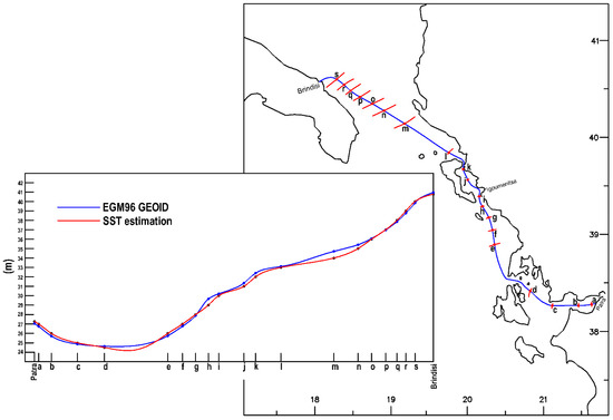 - The significant differences between the estimates of the present work (SST estimate) and the geoid model (EGM96) in the d, e and m regions may be related to strong tectonic changes of the marine subsoil. In fact, in both areas strong tectonic activity has been inferred [39,40]. Moreover, recent studies have provided evidence for serious deposits in the area [41]. However, further investigation is required to corroborate this evidence.