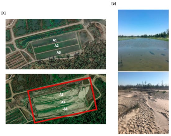 (a) Prado Wetlands demonstration scale unit process open water (UPOW) wetland (Big Bubbs) before (top, Google Earth, taken 12 December 2017) and (bottom) after the 19 February 2019 flooding event (imagery from Google Earth, taken 2 May 2019). This image depicts the introduction of sands and other inorganic sediments and the flowpath of the flooding event. (b) (top) A fully functional demonstration scale UPOW wetland (Cell A3) at Prado Wetlands during normal operating conditions (taken summer 2018) and (bottom) following flow shut-off after the flood event and the resulting sediment intrusion (taken March 2019).