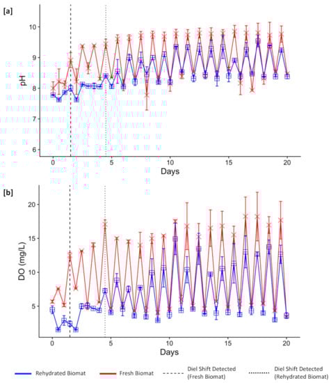 Comparison of diel indicators of photosynthesis, pH (a), and dissolved oxygen (DO) (b) between rehydrated and fresh biomat. The biomat activity in the rehydrated cells takes approximately 10 days to reach similar levels as the fresh cells. Biomat activity is first measurable at 1.5 days for the fresh cells (dashed line) and 5 days for the rehydrated cells (dotted line), demonstrating a start-up period for rehydrated biomat compared to fresh biomat. Points represent the average of biological duplicates with error bars denoting maximum and minimum values.