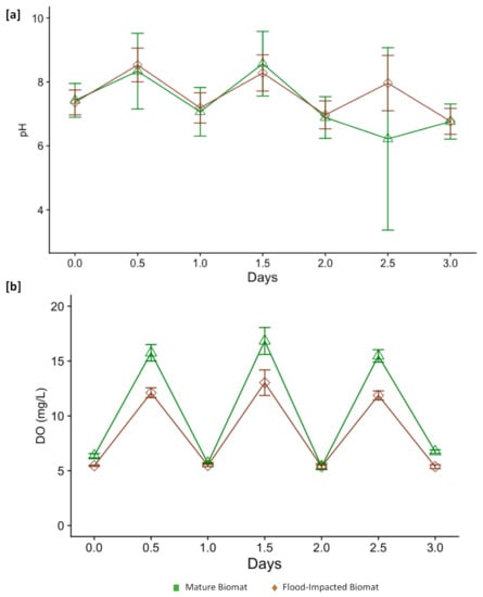 Comparison of diel indicators of photosynthesis, pH (a), and DO (b), between flood-impacted and mature biomat microcosms. Though the pH values in mature and flood-impacted biomat are similar, the DO levels in flood-impacted biomat are consistently lower, demonstrating a decreased level of biomat activity following a flooding event. Points represent the average of biological duplicates with error bars denoting maximum and minimum values.