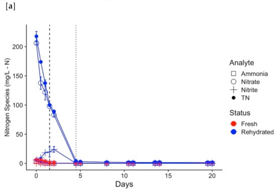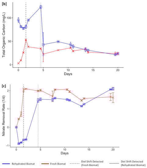 Following the establishment of biomat activity, first order nitrate removal rates for fresh and rehydrated biomats were 1.8 ± 0.4 day−1 and 1.6 ± 0.3 day−1, respectively. As demonstrated by a Mann–Whitney U Test (p = 0.055), rehydrated biomat removed nitrate at a rate comparable to fresh biomat, once the diel shifts in biomat activity, and therefore photosynthetic activity, were detectable (Figure 5). Prior to this inflection point, the nitrate concentration was in excess of the influent, and future research into the nitrate removal pathways is needed to interpret this finding.