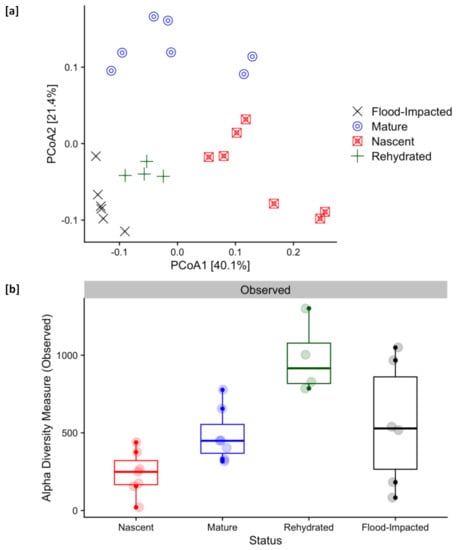 Phylogenetic distances, plotted using a weighted UniFrac principal coordinates analysis (PCoA), were used to assess similarities across sample populations. Alpha diversity was utilized to quantify the number of species (i.e., richness) while relative abundance was used to evaluate the evenness of species distribution within and between each community. Phyloseq was used to visualize alpha diversity, conduct principal coordinate analyses, and create PCoAs of sample data. A weighted UniFrac PCoA was utilized to visualize the comparison between mature and flood-impacted field samples and to compare samples from the rehydrated flow-through microcosms [50]. All adonis and beta dispersion calculations were conducted using vegan. DESeq2 was used to determine Log2FoldChange between samples in order to discern the most pronounced taxonomic shifts associated with disruption.
