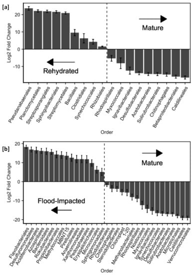 The Log2FoldChange illustrates the orders that have undergone the largest change during desiccation/rehydrated (a) and flooding (b). Both figures illustrate the impact of each disruption, suggesting a degradation of geochemical and redox stratification due to either desiccation and/or the energy of the flooding.