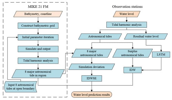 The method used in this study is shown in Figure 1. The entire study can be divided into three parts: Construct a model of 8 major astronomical tides using the MIKE21 FM, forecast the model residuals at the observation stations, and distribute the forecasts at nonmeasured locations.