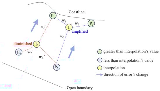 When using three-point interpolation (3PM) based on inverse distance weighting (IDW), the value of interpolating point I1 may be amplified if it is closer to the two observation stations along the coastline, and the value of interpolating point I2 may be diminished if it is closer to the two observation stations far away from the coastline.
