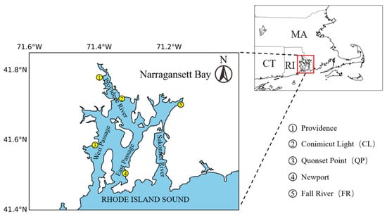 The Narragansett Bay drainage basin covers an area of 4714 km2 and is located on Rhode Island, USA. A total of 370 km2 of this area is in Narragansett Bay (40°21′–41°51′ N, 71°9′–71°30′ W), which is the largest semiclosed estuary in the northeastern United States [33]. Fresh water flowing into the bay comes mainly from the Taunton, Blackstone, and Pawtuxet Rivers. However, compared with the tide, the magnitude of river discharge (combined yearly average of 105 m3 s–1) is very small [34]. Seawater enters Narragansett Bay through three routes: The East Passage, West Passage, and Sakonnet River. The water depth in the East Passage is 16–48 m, while the West Passage is shallower (6–16 m) [35]. The diurnal range at Newport is 1.1 m and increases to 1.5 m at Providence.